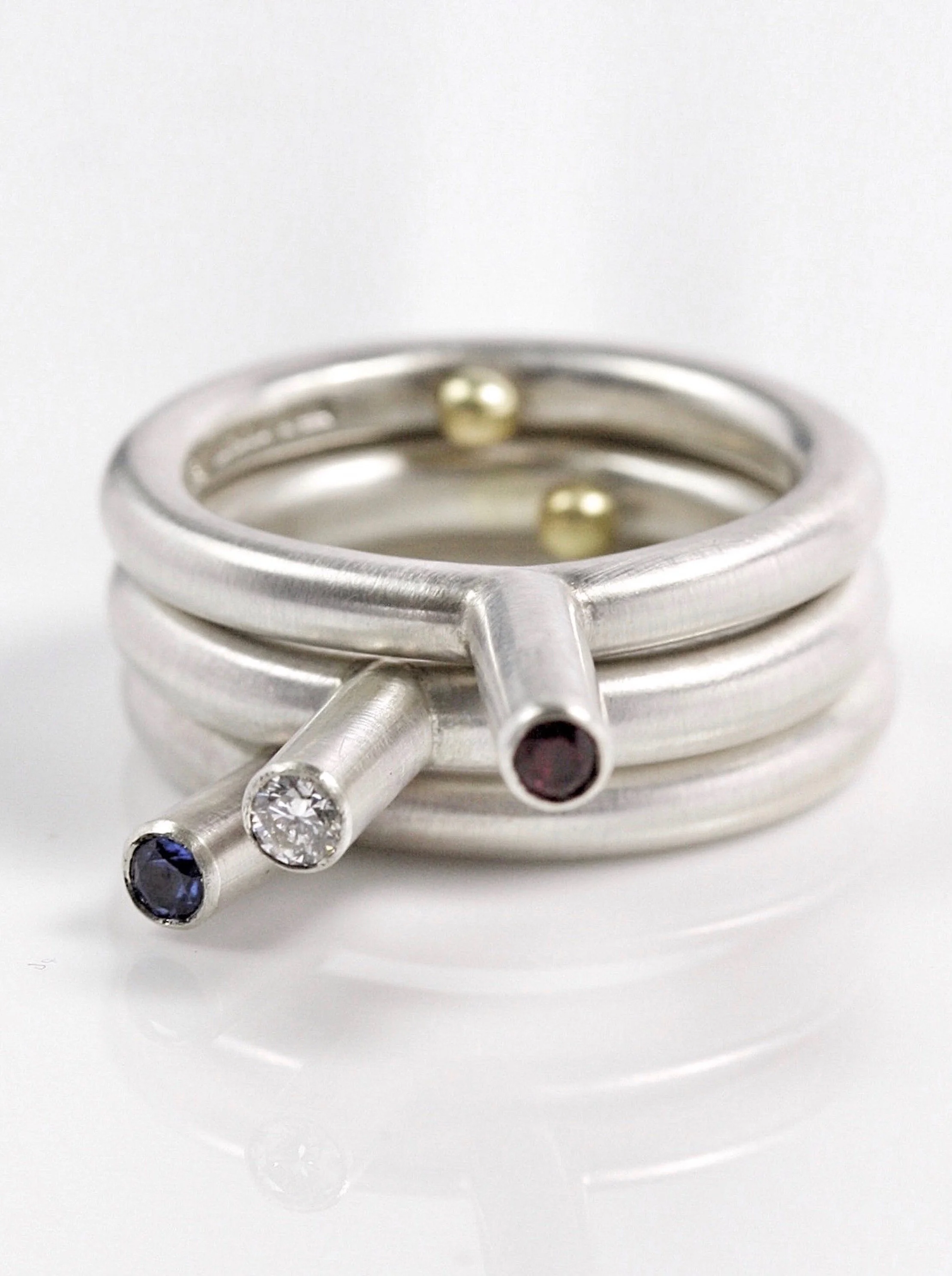 Pieces consist of curves and straight lines which create negative and positive spaces. For the development of my ideas she uses precious metals and stones and the results are always unique and handcrafted.